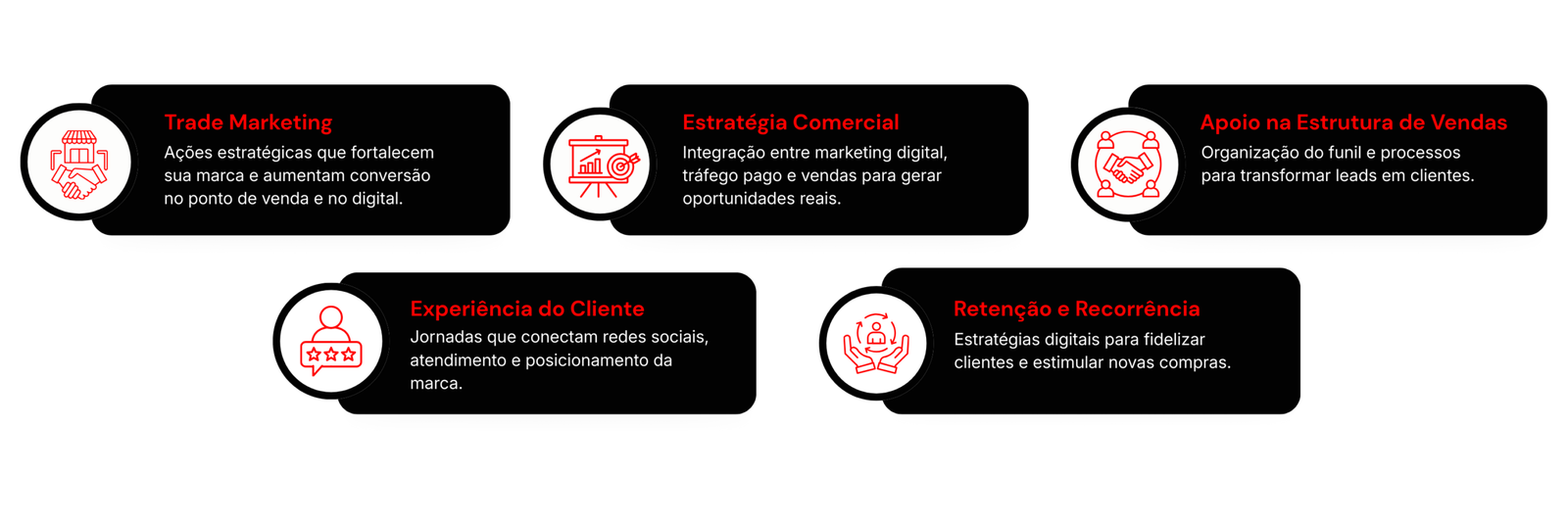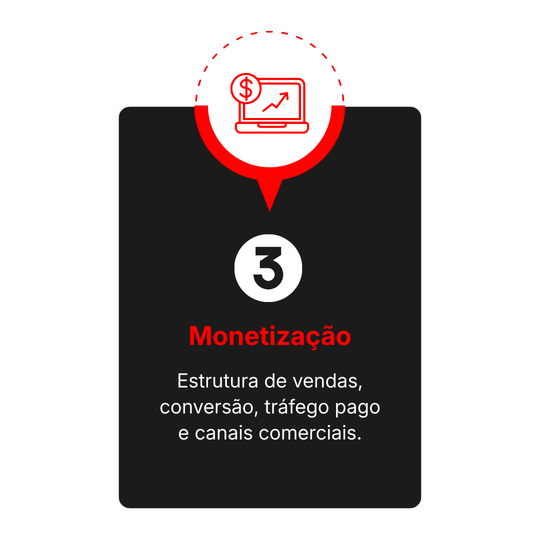 Criamos sistemas de crescimento previsível para empresas que querem escalar com estrutura comercial, processos claros e decisões orientadas por dados. Atuamos do posicionamento à aquisição de clientes, passando pela conversão e pelo pós-venda, organizando todas as etapas do funil de vendas.